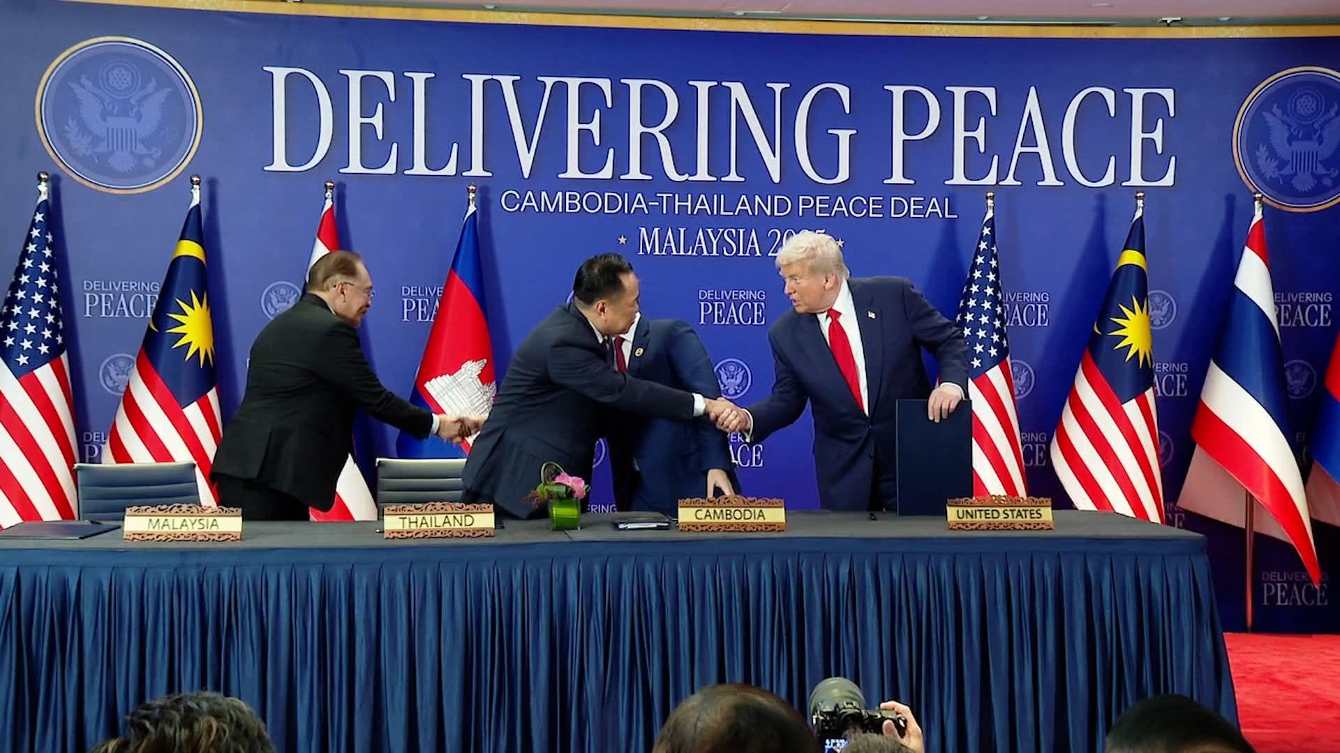 Tajlandia i Kambodża podpisały w niedzielę w Malezji wspólną deklarację, zobowiązując się do zakończenia działań wojennych na ich od dawna spornej granicy. Ceremonii przewodniczył prezydent USA Donald Trump jako kluczowy świadek. Porozumienie, nazwane Porozumieniami Pokojowymi z Kuala Lumpur, zostało podpisane na marginesie 47. Szczytu ASEAN, w otoczeniu flag amerykańskich i wyrazistych słów „Delivering Peace” (Dając Pokój). Zdjęcia ukazują przywódców trzymających dokument.